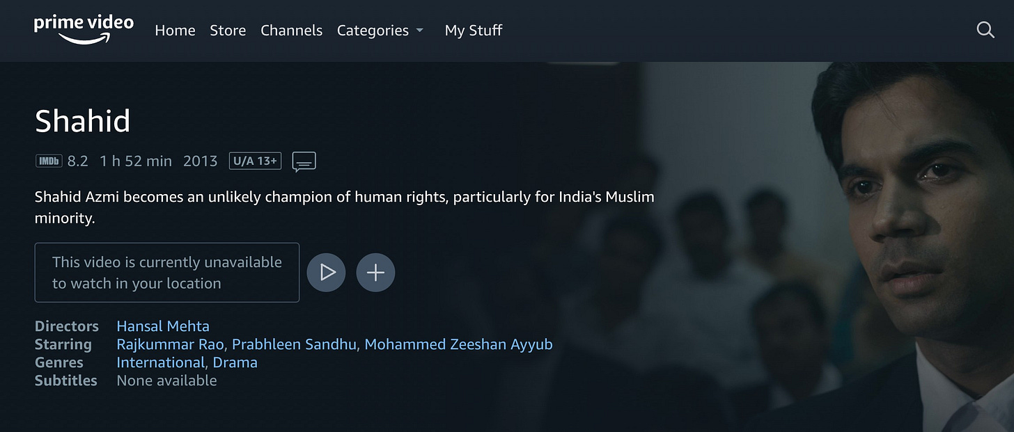An Indian friend posted something on the feebs the other day noting that an Indian made movie about an Indian lawyer fighting for Muslim rights had been geo-blocked for the entirety of India. It was blocked by Amazon.